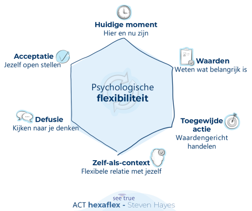 Het bevat verdieping in Mindfulness en Bewuste Waardevolle Actie oefeningen om Psychologische Flexibiliteit te bereiken.